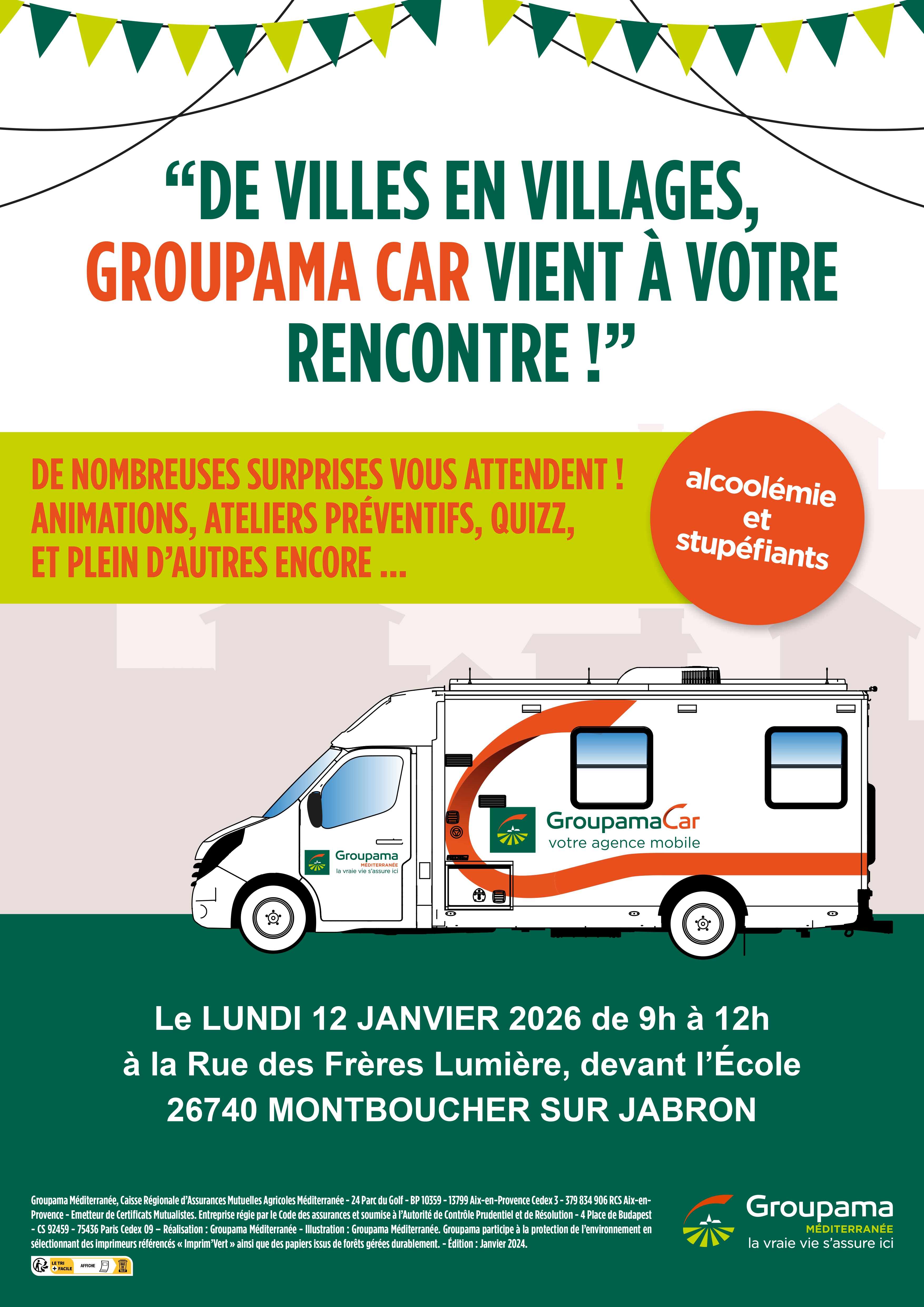 Le camion Groupama Méditerranée sera présent dans la commune le lundi 12 janvier 2026 de 9h à 12h afin de vous sensibiliser à des actes de prévention et d’informations (Lunettes de simulation : alcoolémie, cannabis, fatigue. Démonstration d’un défibrillateur DAE sur mannequin. Remplissage d'un constat amiable. Le carrefour à sens giratoire...). Cette démarche n'a aucune vocation commerciale.